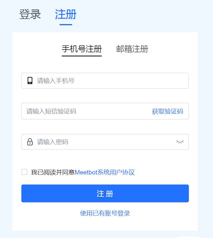 - 勾选“我已阅读并同意Meetbot系统用户协议”