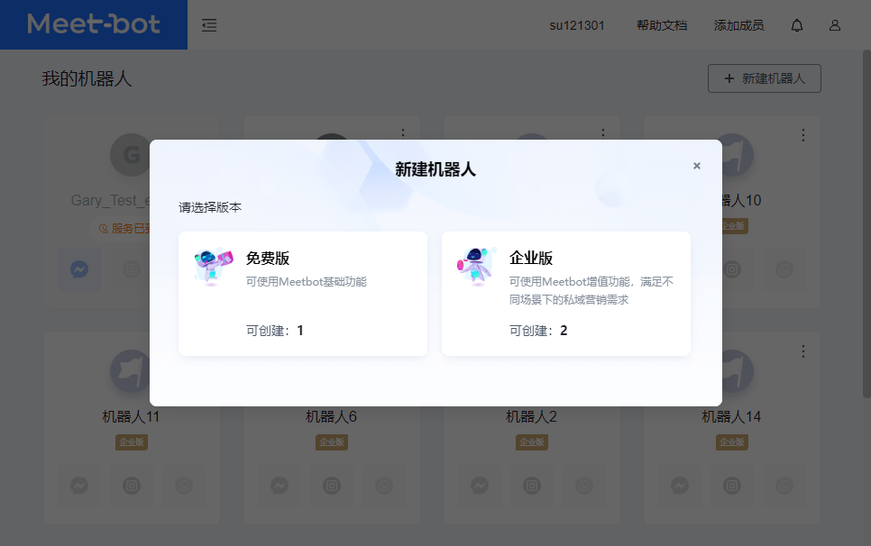 - 【免费版】免费版机器人将只有Meetbot的基础功能,并且会有14天的使用时间,14天后,该机器人将不可用。